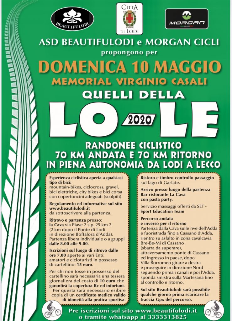 Da Lodi a Lecco e ritorno , 140 km non competitivi di fuoristrada sulle rive dell’Adda in piena autonomia , tra paesaggi mozzafiato , centrali liberty, il traghetto di Leonardo , natura in parte ancora incontaminata . Aperto agli Enti e tessera assicurazione giornaliera per i non possessori di cartellino. Info e regolamento sul sito www.beautifulodi.it